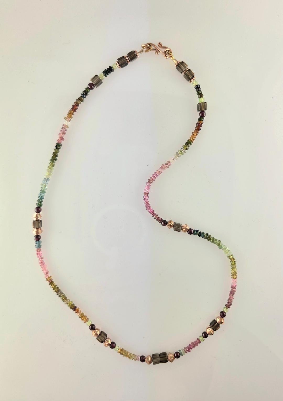 With Smokey Quartz, Garnet and Rose Gold Vermeil Beads and Clasp. 18 1/2 in length.